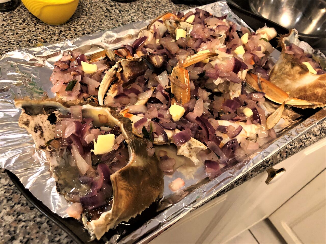 ガーリックバターグリルは玉ねぎとガーリックをバター、塩コショウで炒めて(セロリがあれば尚良し)生のクラブにレモン汁と共にまんべんなくかけます。