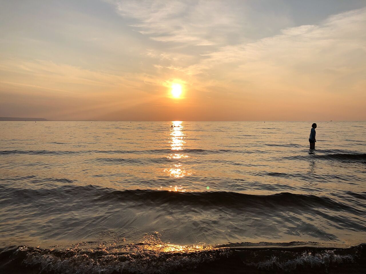 見渡す限り永遠と続く地平線上に浮かぶ夕日と穏やかなさざ波。